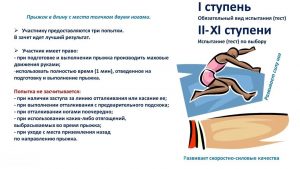 Одним из нормативов комплекса ГТО поэтому является ПРЫЖОК В ДЛИНУ С МЕСТА ТОЛЧКОМ ДВУМЯ НОГАМИ — замечательное тестовое испытание, демонстрирующее скоростно-силовые возможности участников движения.